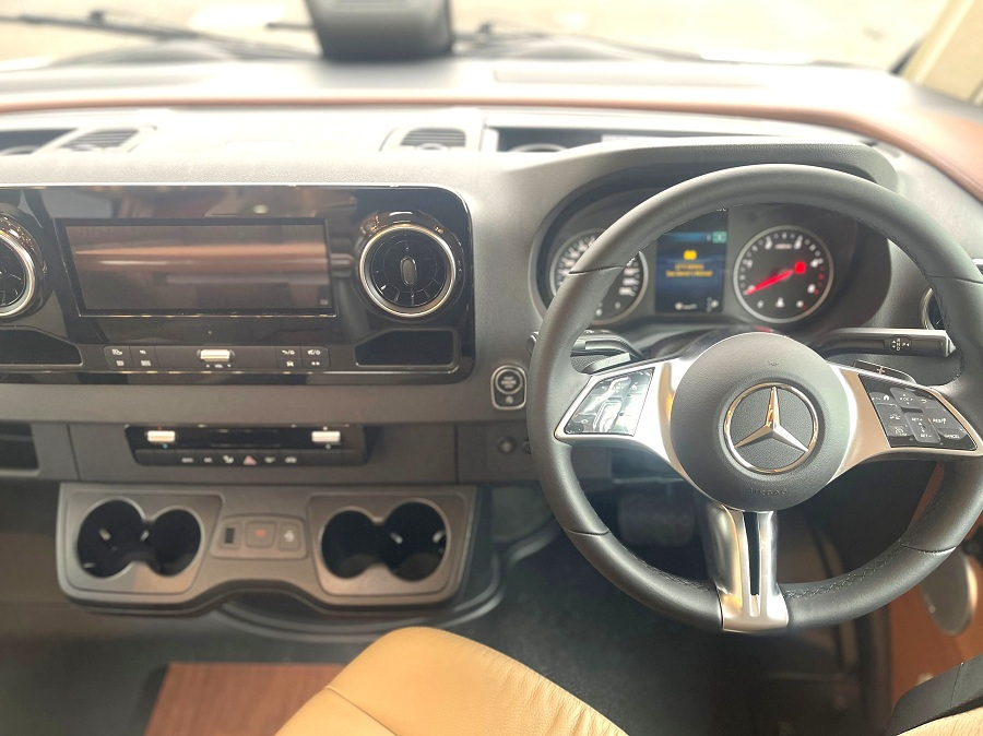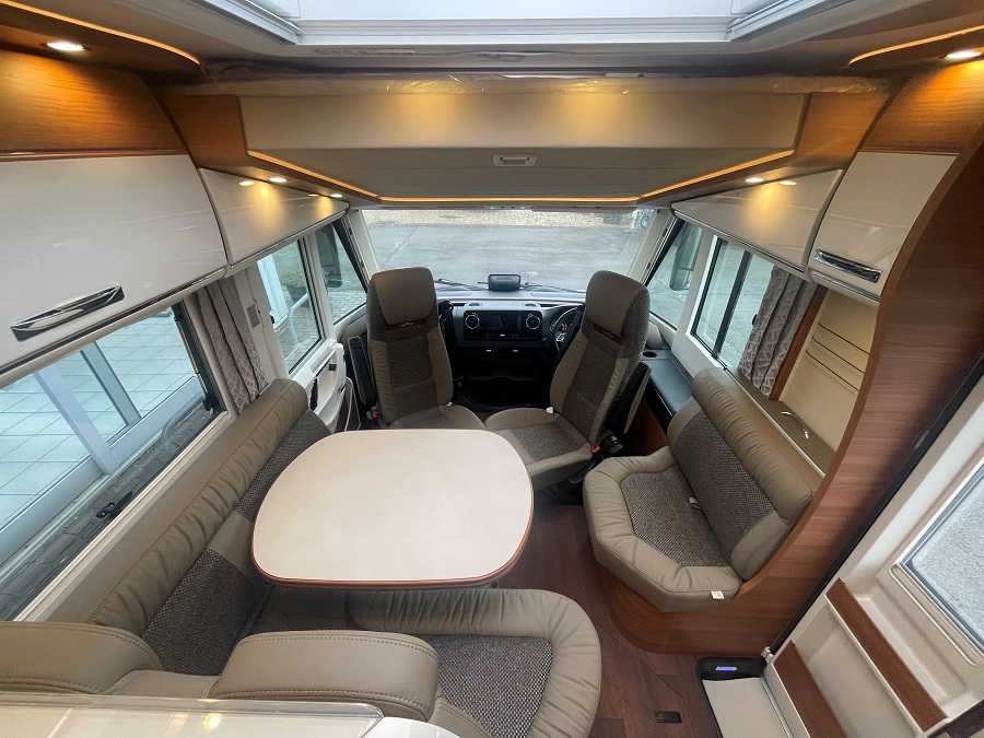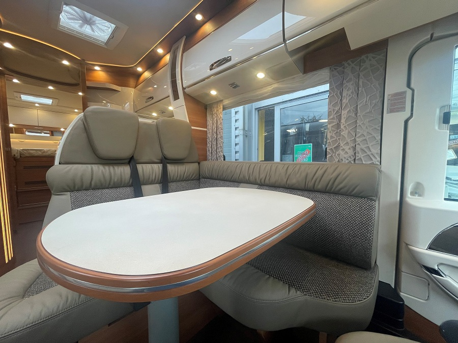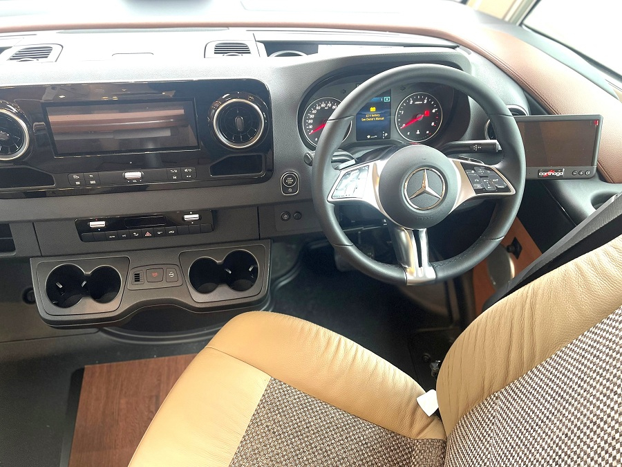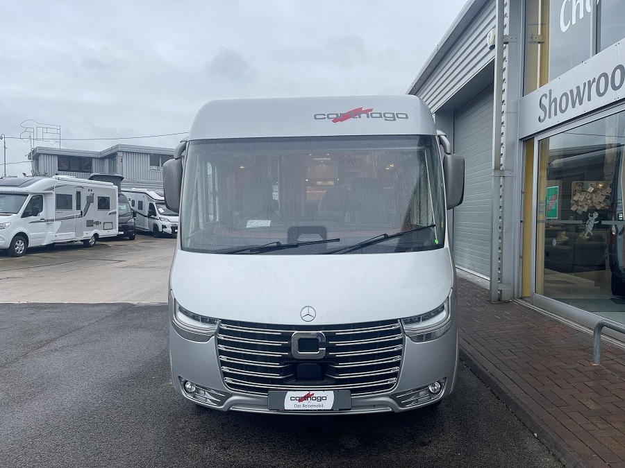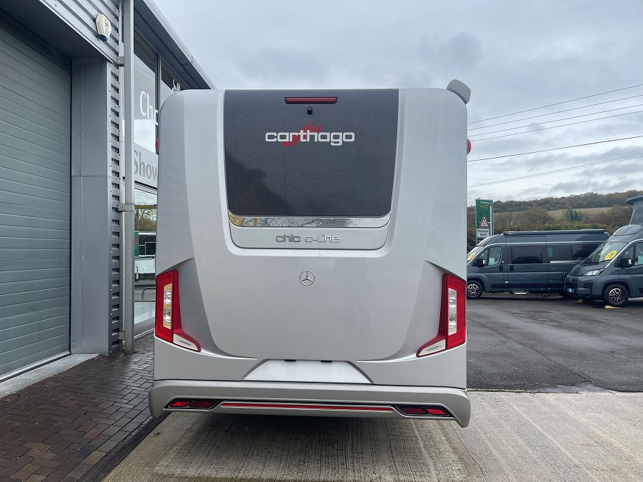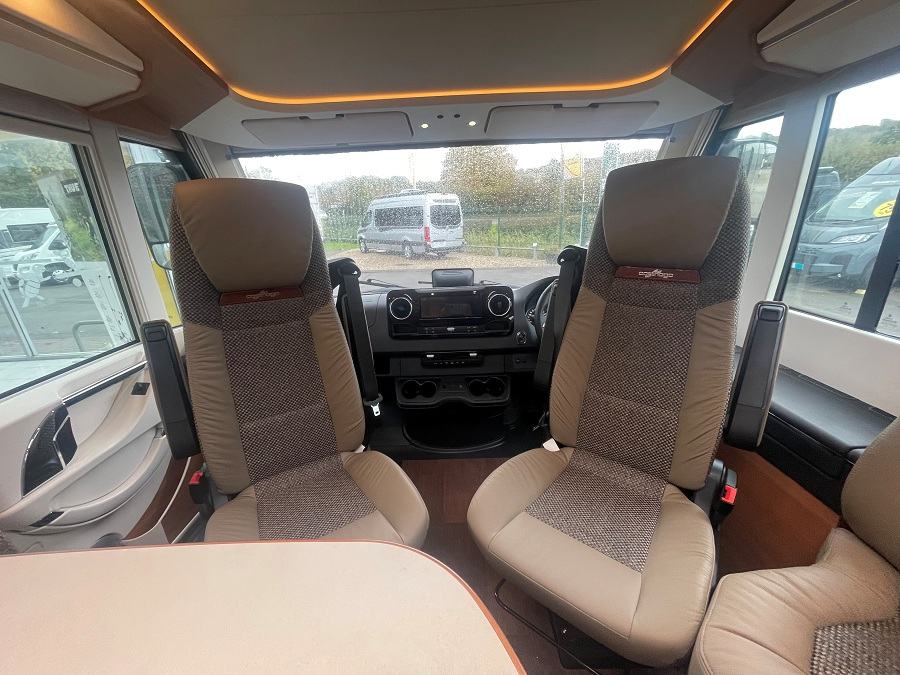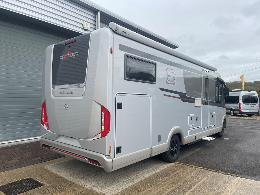 Extras include: 16" Black Alloy wheels with all-weather tyres, Aluminum Awning, Cab air conditioning, Capsule Coffee maker, Carthago Security alarm system, Carthago Super Package, Chassis Plus Package for Mercedes, Cruise control, External Shower point, Gas oven with grill function, Living area 32" TV package, Macchiato Part leather upholstery, Mercedes-Benz drivers assistance package, Reversing camera, Sat-nav and Solar Panel.